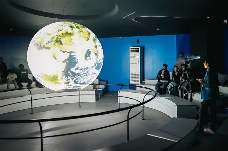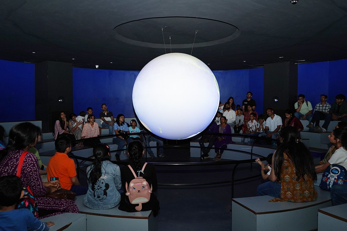 Knowledge on Sphere Show(KOS) is a room sized global display system that uses computers and video projectors to display planetary data onto a six foot diameter sphere, analogous to a giant animated globe. It is s an educational tool to help illustrate Earth System science to people of all ages. Animated images of atmospheric storms, climate change, and ocean temperature can be shown on the sphere, which is used to explain what are sometimes complex environmental processes, in a way that is simultaneously intuitive and captivating.